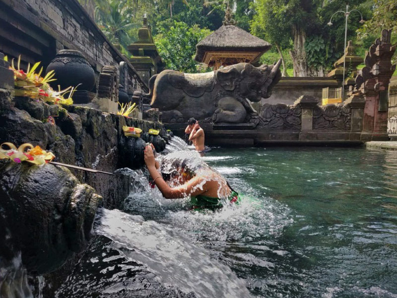 - Đền Tirta Empul: ngôi đền được tôn thờ như là đời sống tinh thần của người dân địa phương, là nơi làm thanh lọc tâm trí, linh hồn tan biến những lo toang, muộn phiền, tội lỗi hay những ảnh hưởng xấu trong cuộc sống. Phía trước đền là hồ nước thiêng… dù là dân địa phương hay người theo đạo Hindu đến từ các nơi trên thế giới khi tới Tampak Siring đều có ước nguyện được tắm mình qua mười hai dòng chảy thiêng liêng, với mong muốn được gột rửa bụi trần, gột rửa những điều không may mắn trên cơ thể và linh hồn, muốn được thần linh ban phước, vuốt ve và che chở, mang lại cho họ một cơ thể mạnh khỏe, một tâm hồn thanh tịnh và một trí tuệ minh mẫn.