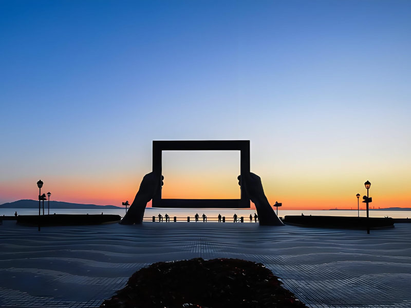 Sau khi ăn trưa, đoàn tiếp tục tham quan và chụp ảnh tại Khung Ảnh Lớn Uy Hải– công trình check-in nổi tiếng ven biển, được thiết kế như một khung ảnh khổng lồ hướng ra đại dương. Từ đây có thể bắt trọn khung cảnh trời xanh – biển biếc – thành phố, tạo nên những bức hình “sống ảo” đầy ấn tượng, đặc biệt đẹp vào lúc bình minh và hoàng hôn.